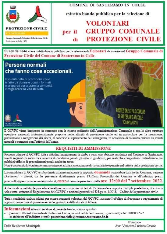 Si rende noto che è indetto bando pubblico per la selezione di Volontari da inserire nel Gruppo Comunale di Protezione Civile del Comune di Santeramo in Colle.